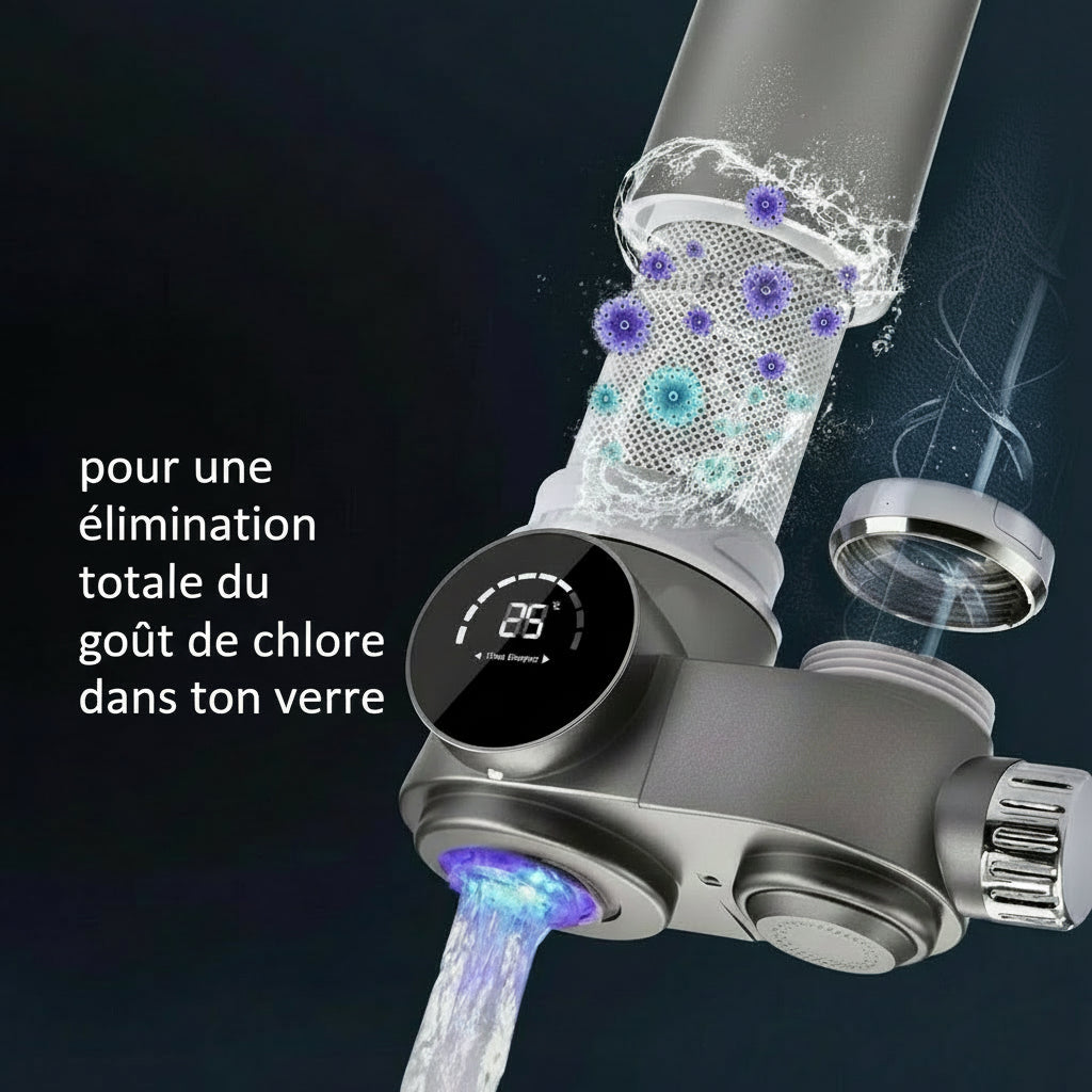 Doté de 8 couches de filtration et d'une désinfection UV, le purificateur d'eau élimine efficacement les impuretés, le chlore et autres contaminants, garantissant une eau saine pour toute la famille